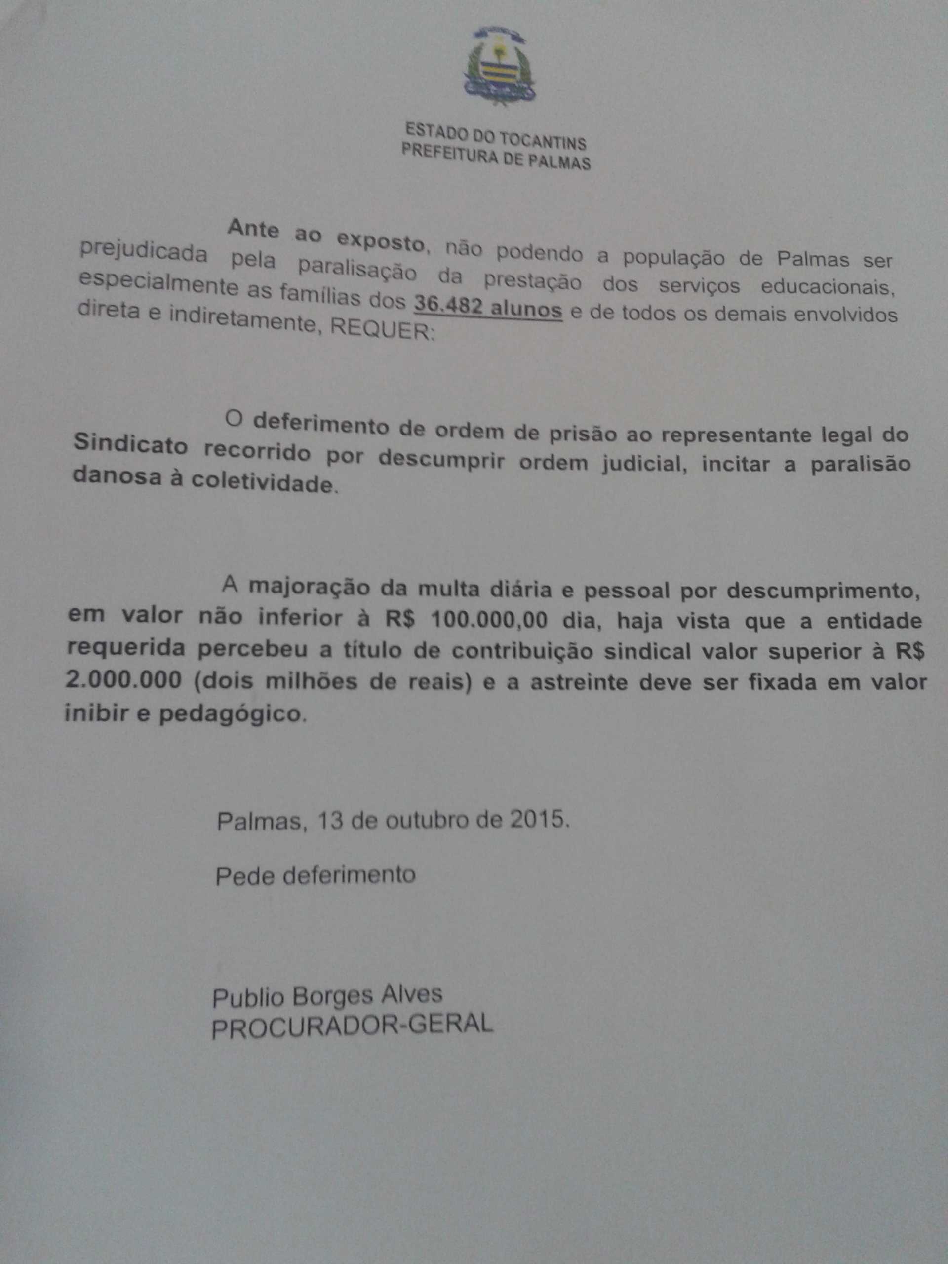 A petição acrescenta que mais de 36 mil crianças estão sendo prejudicadas com a paralisação dos professores, que se encontram sem as instruções formais das aulas e as alimentações diárias. Para a Prefeitura de Palmas, a manutenção da greve gera “insegurança pública e desordem social”. “Além de tentar fazer prevalecer o interesse particular das categorias em detrimento do interesse público”, discorre o procurador geral.