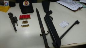 Diante da recusa, foi feita uma vistoria na documentação e em seguida no interior do veículo, sendo encontrado um revólver calibre 38 com cinco munições intactas, além de sete munições de calibre 28, doze munições de calibre 22, uma espingarda de pressão CBC alterada para calibre 12 e uma arma branca tipo espada de aproximadamente 50 centímetros.