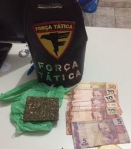 A equipe de militares da Força Tática realizava patrulhamento quando se deparou com os indivíduos em atitude suspeita. Após a busca pessoal, os militares localizaram uma barra de substância análoga à maconha e a quantia de R$ 95 reais em dinheiro.