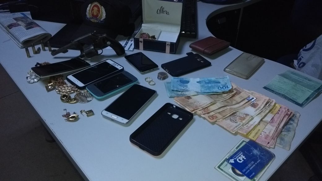 Com o indivíduo foi localizada uma arma de fogo, tipo revólver, calibre 38, três munições intactas e uma deflagrada, mais um aparelho celular, que posteriormente foi reconhecido por uma das vítimas que esteve na Delegacia de Polícia.