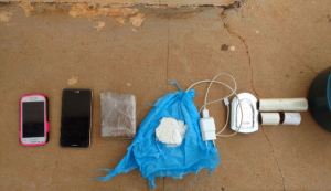 Ao avistarem a viatura da PM, os suspeitos fugiram e deixaram para trás três aparelhos celulares e uma sacola que continha algumas ferramentas e um frasco com 17 trouxas de substâncias análoga a cocaína.