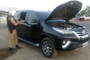 Por meio da numeração do motor os policiais constataram que sua verdadeira placa de identificação seria PDA 8989 com registro de furto e roubo no estado pernambucano. Dois homens que estavam conduzindo a SW4 foram presos.