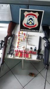 Após buscas realizadas no interior de um dos barracos, os agentes localizaram e apreenderam duas três armas de fogo tipo espingarda, calibre 22, além de munições intactas de vários calibres, bem como dois mosquetes de “espera” de animal silvestre.
