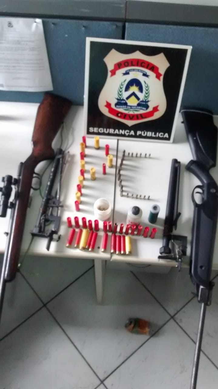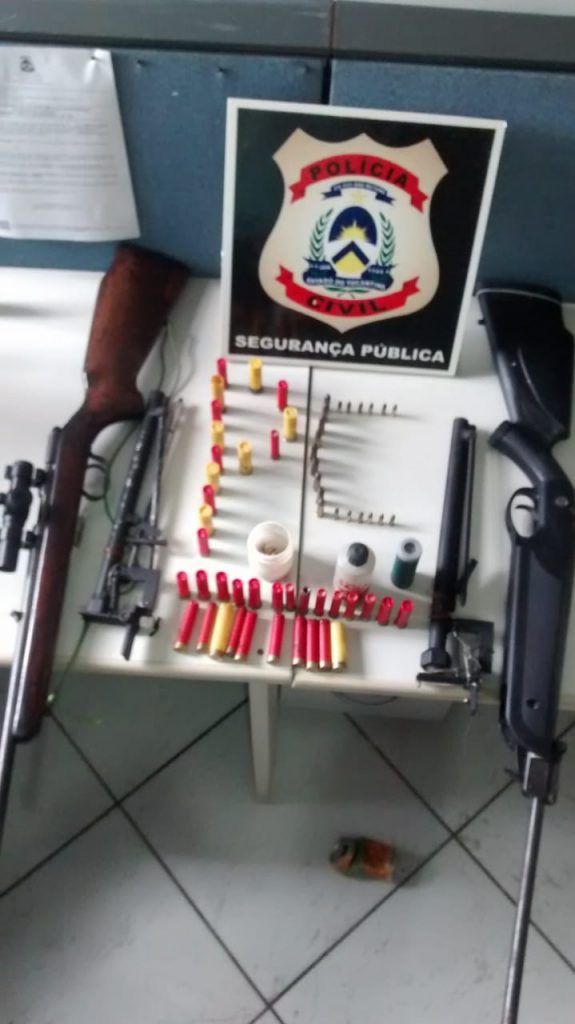 A Polícia Civil do Tocantins, por intermédio da Delegacia de Xambioá, apreendeu nesta quarta-feira, 2, três espingardas, bem como munições de calibre 22 que estavam em poder de dois indivíduos em uma propriedade rural daquele município. Na ocasião, os suspeitos de iniciais E.M.S, de 37 anos de idade E.P.S, de 44 anos foram presos e autuados em flagrante pelos crime de posse ilegal de arma de fogo.