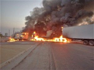 Numa colisão grave no início da noite desta quinta-feira, 01, dois caminhões ficaram praticamente destruídos após baterem, na altura do trevo de acesso ao Parque Industrial de Gurupi, cerca de 200km de Palmas. Ambos pegaram fogo e o Corpo de Bombeiros Militar foi acionado para o combate às chamas.