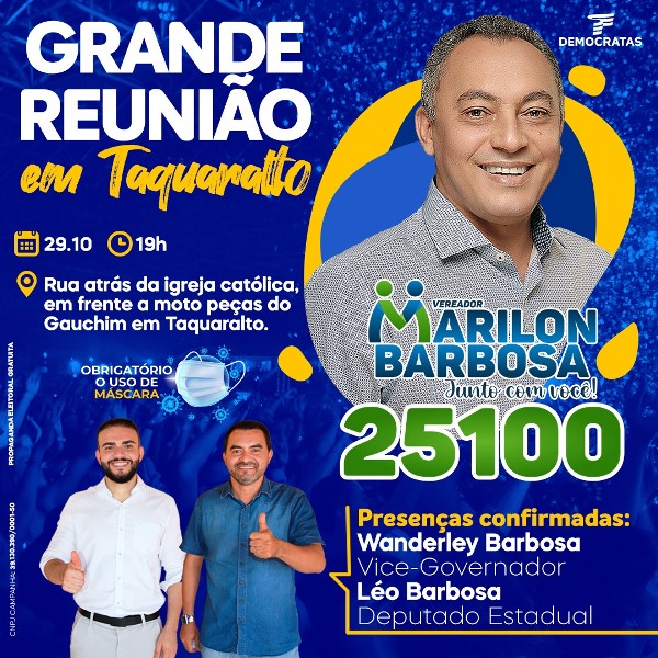 O vereador e candidato a reeleição Marilon Barbosa realiza nesta quinta-feira, 29, às 19 horas, uma grande reunião em Taquaralto com lideranças e apoiadores.