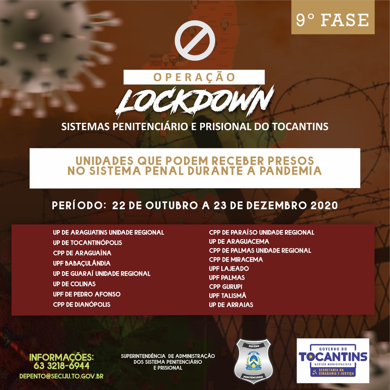 Dando continuidade às ações de combate e prevenção à Covid-19 nas unidades penais do Tocantins, a Secretaria de Estado da Cidadania e Justiça, por meio da Superintendência de Administração dos Sistemas Penitenciário e Prisional, deflagrou nesta quinta-feira, 22, a nona fase da Operação Lockdown nos presídios e cadeias públicas do Tocantins. Nesta etapa, 17 unidades distribuídas em oito regionais foram selecionadas para continuar recebendo novos presos no Sistema.