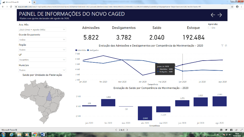 Os dados são referentes ao mês de agosto de 2020, e apontam que pelo quarto mês consecutivo, ou seja, desde maio de 2020, o número de empregos vem crescendo. No acumulado do ano, considerando o período de janeiro a agosto, a variação relativa do saldo de empregos no Tocantins foi de 1,41%, o quinto melhor desempenho do país, sendo superado apenas pelos Estados do Acre 3,11%, Mato Grosso 1,80%, Maranhão 1,74% e Pará 1,67%.