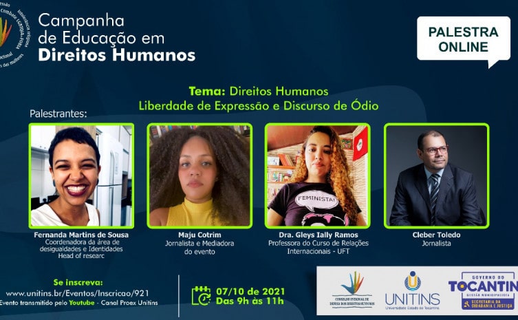 O Conselho Estadual de Defesa dos Direitos Humanos (CEDDH), ligado à Secretaria de Estado da Cidadania e Justiça (Seciju), realiza a 1ª Edição da Campanha Estadual de Educação em Direitos Humanos nesta quinta-feira, 7. O evento, que tem como tema Liberdade de expressão e discurso de ódio, será transmitido ao vivo pelo YouTube da Pró-Reitoria de Extensão da Universidade Estadual do Tocantins (Unitins), a partir das 9 horas. Para receber o certificado, é necessário se inscrever por meio deste link, mas a palestra será aberta para a população em geral.