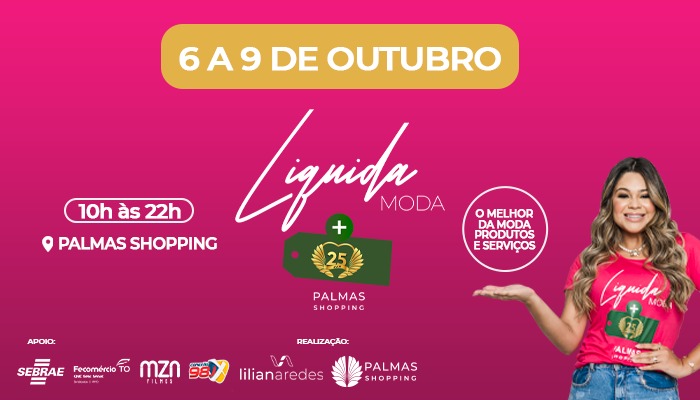 O maior evento de moda, gastronomia, beleza e acessórios do Tocantins será realizado aqui no estacionamento do Palmas Shopping. O Liquida Moda chega à sua 15ª edição entre os dias 6 a 9 de outubro, reunindo mais de 50 lojistas de diversos segmentos comercializando produtos de alta qualidade com descontos de até 70%.