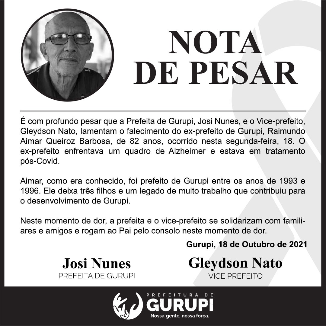 Neste momento de tristeza e luto, rogo ao nosso eterno e bom Deus que console os corações de seus familiares, amigos e de toda comunidade gurupiense que, certamente, sente a partida de Raimundo Aimar.