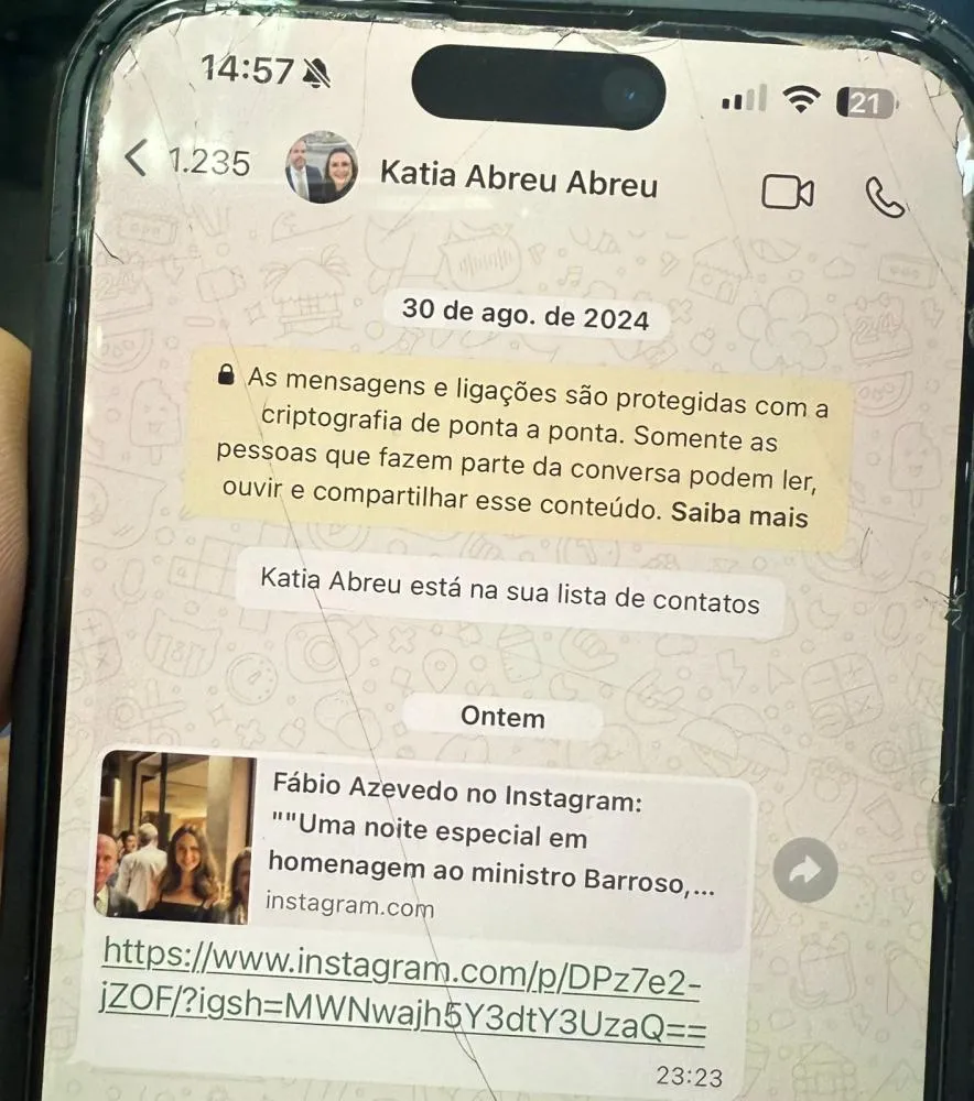 A ex-senadora Kátia Abreu resolveu inovar no marketing político, em vez de propostas, enviou fotos de bastidores. Deputados estaduais do Tocantins receberam em seus celulares uma imagem da ex-parlamentar ao lado do ministro Luís Roberto Barroso, do STF, clicada durante a festa de despedida do magistrado.