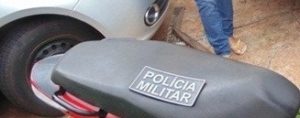 A placa da motocicleta estava adulterada para MWK-7680 com uma fita adesiva, e ao checarem no sistema Infoseg os policiais constataram que a mesma havia sido furtada naquele município.