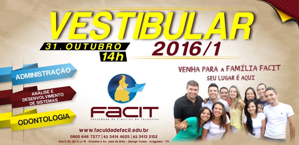 A comissão organizadora do Vestibular 2016/1 da Faculdade de Ciências do Tocantins – FACIT divulgou o edital de convocação, em segunda chamada, dos alunos que participaram do processo seletivo no dia 31 de outubro. As vagas excedentes são para os cursos de Análise e Desenvolvimento de Sistemas e Odontologia. As matrículas devem ser feitas nos dias 12 e 13 de novembro, das 8 às 12 horas e das 14 às 18 horas, e no dia 14 de novembro, das 8 às 12 horas, na secretaria da unidade I da FACIT, localizada na Rua D, nº 25, no setor George Yunes, em frente à Avenida José de Brito.