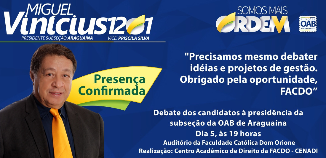 Nesta quinta-feira, dia 5, o Centro Acadêmico de Direito – CENADI da Faculdade Católica Dom Orione – FACDO promoverá um debate entre os candidatos à presidência da subseção da Ordem dos Advogados do Brasil – OAB em Araguaína, às 19 horas, no auditório da faculdade. O advogado Miguel Vinícius confirmou presença no evento. “É a melhor forma de expormos nossas ideias e amadurecermos nosso projeto de gestão. É importante que os colegas advogados avaliem minuciosamente cada proposta e estamos preparados para responder todos os questionamentos”, afirma o candidato.