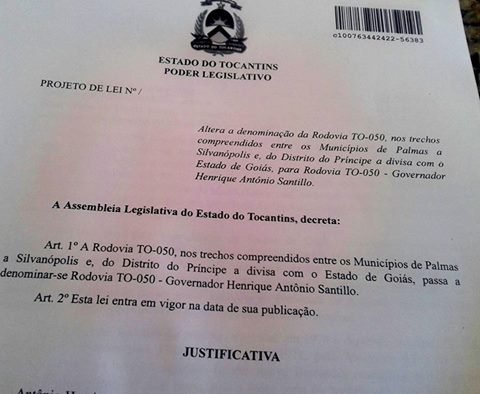 O deputado estadual Wanderlei Barbosa (SD) apresentou nesta quarta-feira,11, Projeto de Lei que prevê a denominação da Rodovia TO-050 para TO-050 – Governador Henrique Antônio Santillo.