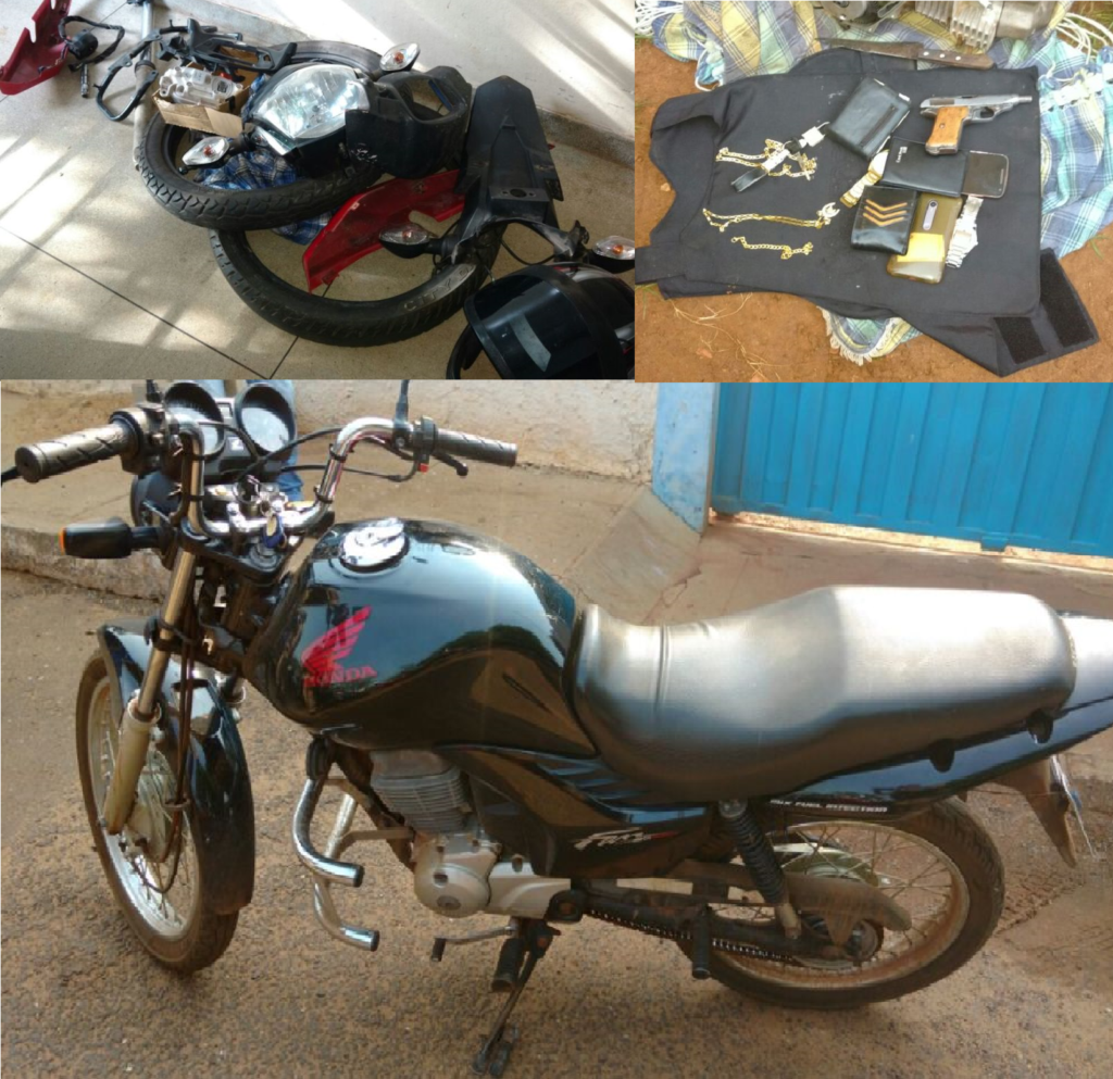Outra motocicleta com registro de roubo foi encontrada em uma residência no setor Couto Magalhães, além de uma pistola calibre 22 e várias peças de motos. Alguns indivíduos tentaram fugir com a chegada dos policiais, mas três deles foram detidos, com os quais foram encontrados dois celulares, dois relógios, joias e dinheiro. Os suspeitos, o veículo roubado e os objetos retidos foram encaminhados para a Delegacia de Plantão. O proprietário da motocicleta roubada teve seu bem restituído.