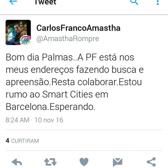 De acordo com uma postagem do prefeito em uma rede social ele se encontra fora do Brasil, na Espanha. Na frase Amastha diz: “Bom dia, Palmas. A PF está nos meus endereços fazendo busca e apreensão. Resta colaborar. Estou rumo ao Smart Cities em Barcelona esperando”.