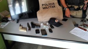Após os envolvidos informarem sobre dois homens que faziam receptação em Praia Norte, os policiais deslocaram à cidade. Os suspeitos foram encontrados e no local havia uma televisão, uma pistola airsoft, um simulacro artesanal de arma de fogo, uma arma branca, aparelhos de celular e papelotes de maconha.