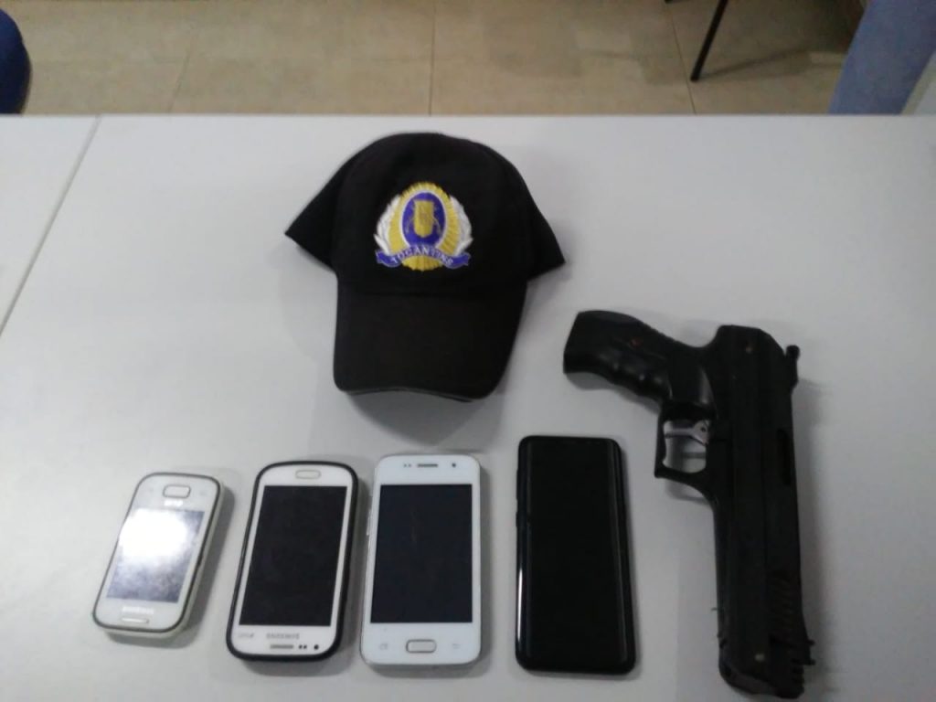 Ao serem informados via 190, imediatamente os policiais militares localizaram e abordaram três adolescentes suspeitos nas imediações, os quais foram reconhecidos pela vítima. Com os envolvidos foram apreendidos 04 aparelhos celulares e um simulacro de arma de fogo que teria sido utilizado na ação infracional.