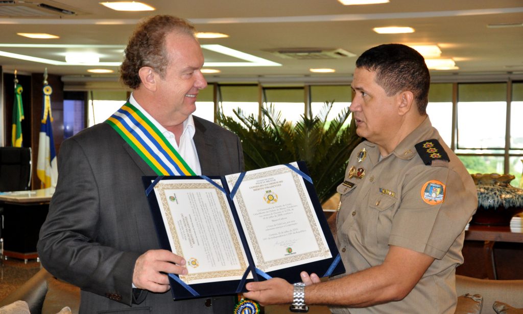 O governador do Estado do Tocantins, Mauro Carlesse, foi homenageado pelo governador de Goiás, Ronaldo Caiado, com a Medalha Grã Cruz de Honra ao Mérito Tiradentes pelos serviços prestados à corporação. A entrega da honraria foi feita na manhã desta terça-feira, 26, no Gabinete do Governador, no Palácio Araguaia, pelo assessor militar junto à Procuradoria-Geral de Justiça, Coronel Félix, e pelo procurador-geral Omar de Almeida Júnior.