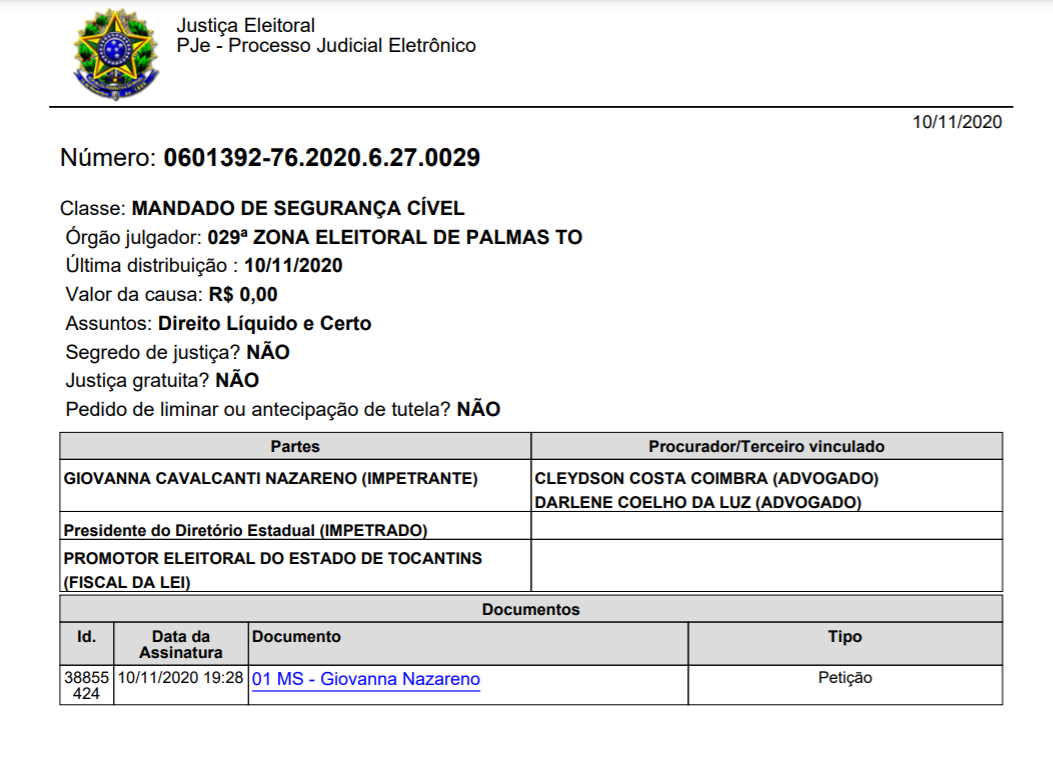 Amastha Eleições 2020 Giovanna Nazareno Justiça Mandado de Segurança PSB Tocantins Tiago Amastha Andrino