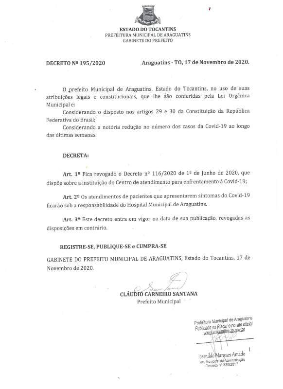 Um Decreto assinado pelo prefeito de Araguatins Cláudio Santana (MDB), acabou com a Unidade de combate à covid-19 no município.
