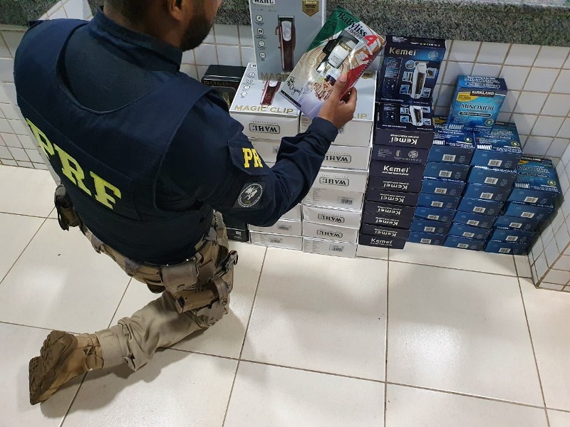 Ao abrir a caixa, a equipe da PRF encontrou em seu interior 26 máquinas de corte de cabelo e 120 fracos de Minoxidil – produto utilizado para crescimento capilar. Se os produtos forem originais, o valor de mercado deles passa de 22 mil reais.
