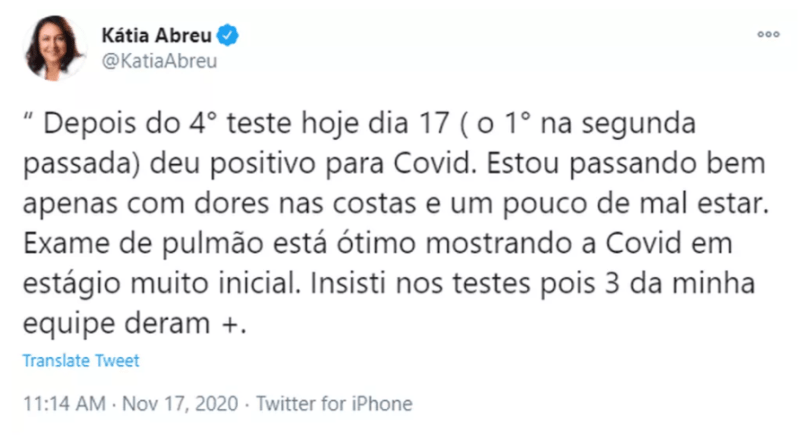 Nessa terça-feira, 17, a senadora Kátia Abreu (PP) anunciou no Twitter que testou positivo para a covid-19. Ela disse que sentiu um mal-estar e algumas dores nas costas, mas que os exames que fez indicaram que não há problemas nos pulmões. Disse também que insistiu em fazer os testes, pois outras pessoas de sua equipe testaram positivo para o vírus.