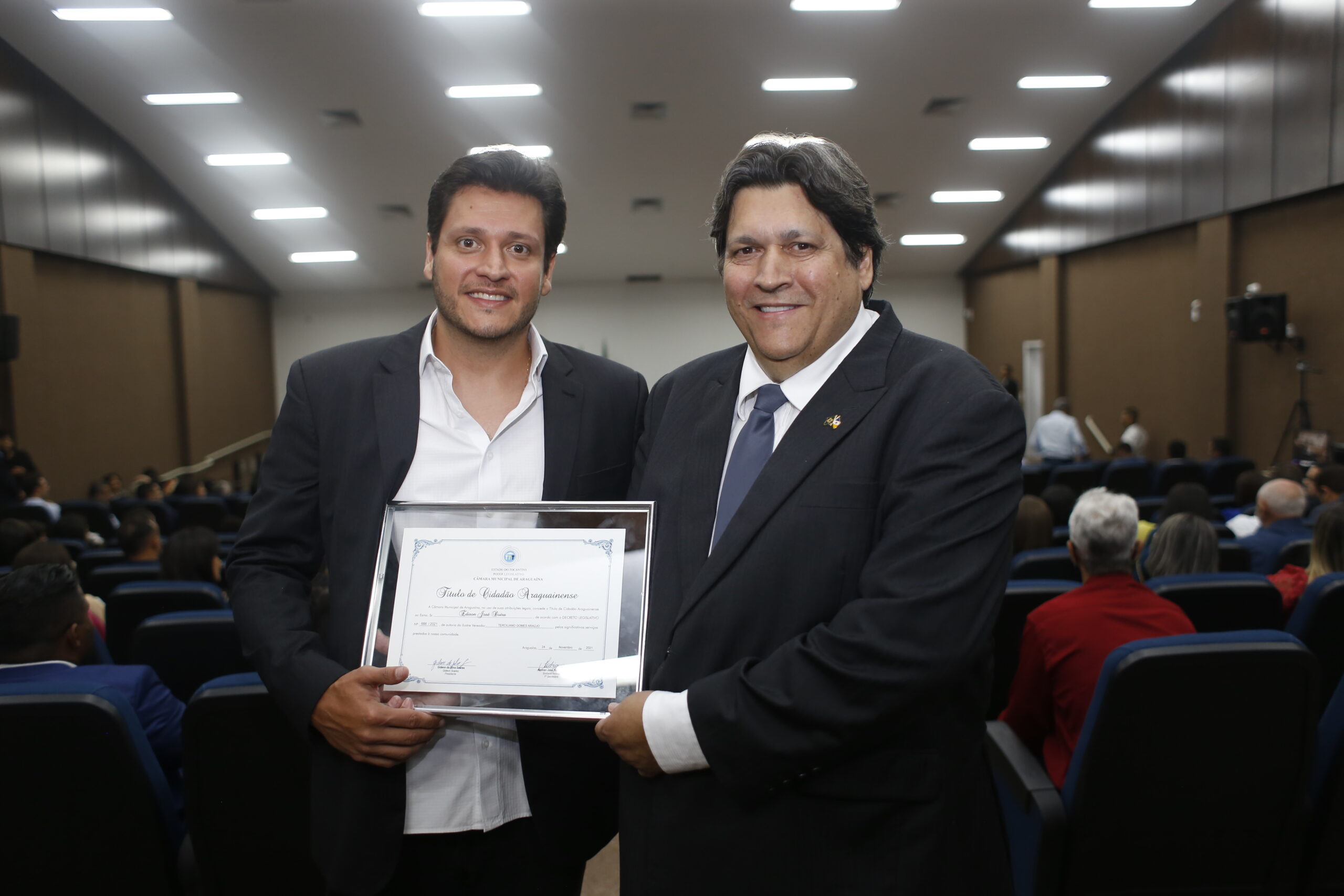 A Câmara Municipal de Araguaína concedeu o Título de Cidadão ao empresário Edison Dutra, presidente do Grupo Tabocão. A sessão solene de entrega da homenagem aconteceu na noite desta quinta-feira, 25, no auditório do Fórum da cidade e foi prestigiada por lideranças políticas, empresários, familiares e amigos de Edison, entre eles, o prefeito de Araguaína, Wagner Rodrigues, que também foi homenageado, a deputada estadual Valderez Castelo Branco e o secretário de Ações Estratégicas do governo do Estado, Lázaro Botelho. O Título de Cidadão Araguaínense é concedido a pessoas que contribuíram com o desenvolvimento da cidade. A homenagem ao empresário Edison Tabocão foi concedida por Decreto Legislativo do vereador Terciliano Gomes.