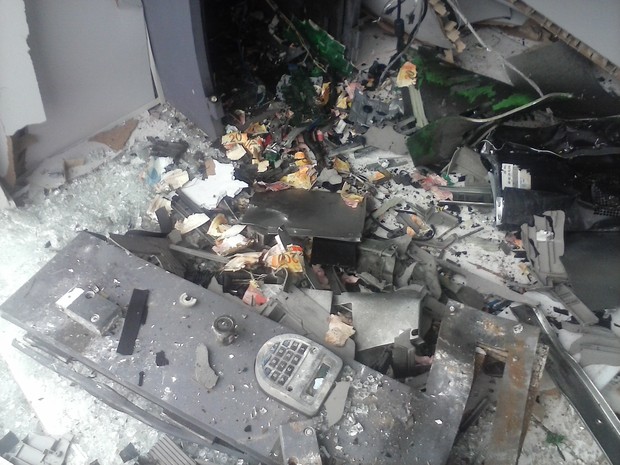 De acordo com a PM, o caixa já tinha sido alvo de explosões três vezes, mas sem sucesso. Na rua, de acordo com policiais, ficaram espalhadas cédulas picadas de dinheiro. No caixa tinha cerca de R$ 5 mil, segundo os militares. O refém foi liberado logo após a explosão.