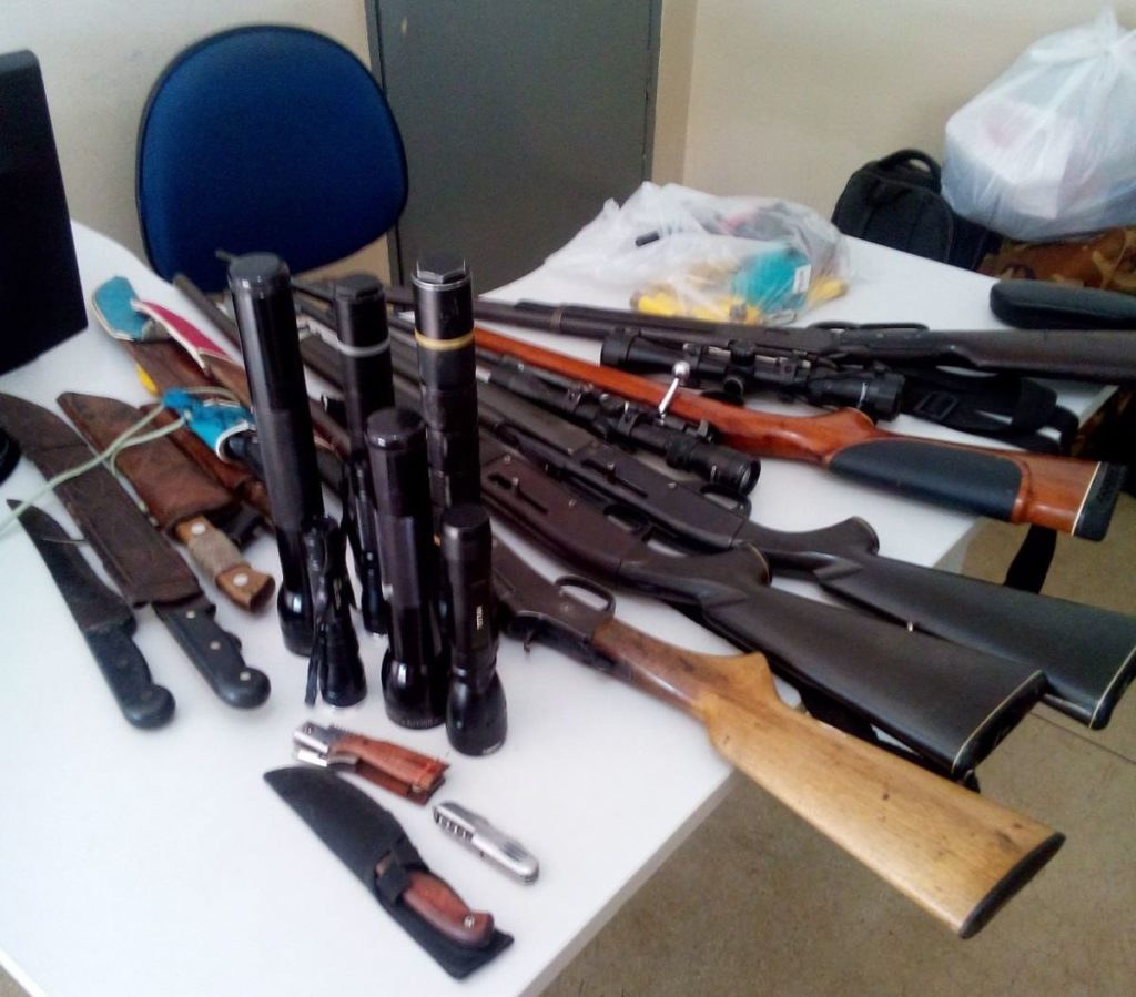 Com o grupo foram apreendidos um rifle calibre 22, uma espingarda cartucheira calibre 20, duas carabinas calibre 22, uma carabina cal. 38, mais 253 munições calibre 22, dezenove munições calibre 38, onze cartuchos calibre 20, dois rádios tipo “HT”, oito lanternas e nove armas brancas.