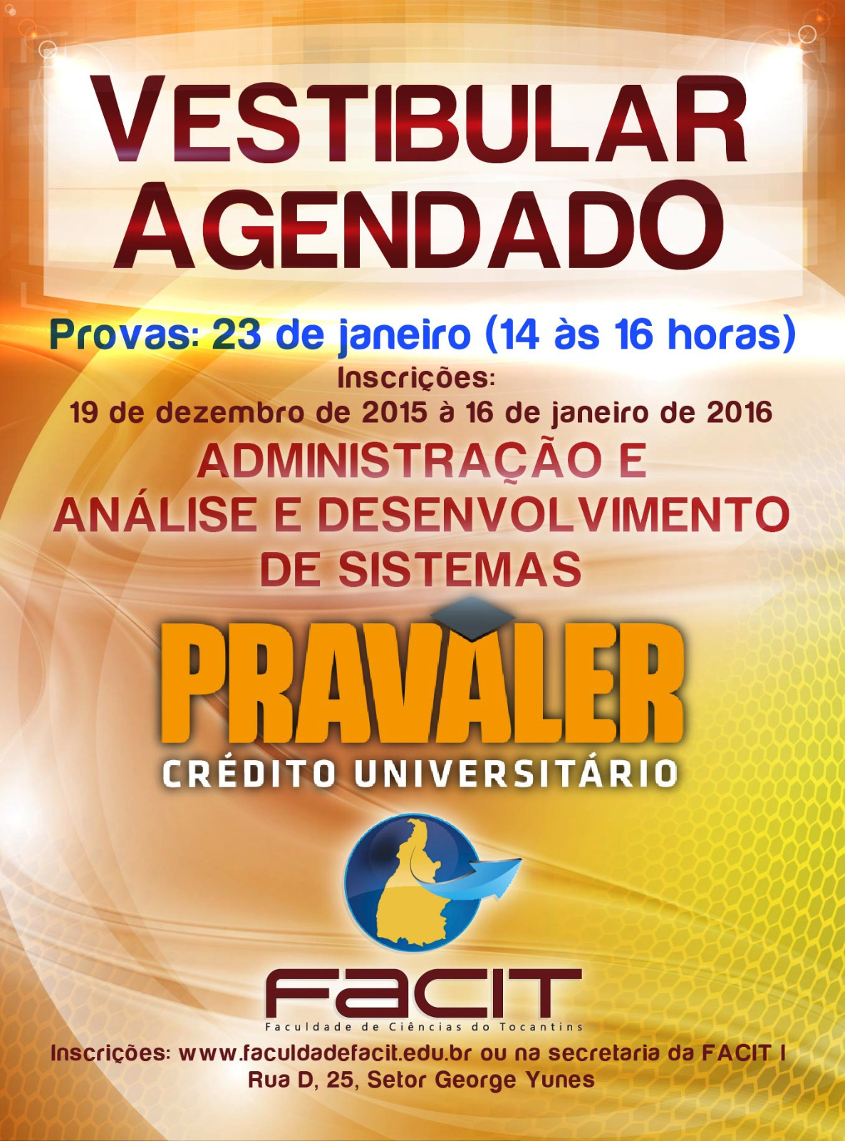 As inscrições para o Vestibular Agendado 2016/1 de janeiro da Faculdade de Ciências do Tocantins – FACIT já estão abertas e vão até o dia 19 de janeiro. As vagas são para o primeiro semestre de 2016 nos Cursos de graduação em Administração e Análise e Desenvolvimento de Sistemas, todos no período noturno.