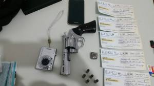 Em virtude disso, o indivíduo foi conduzido à Delegacia para as averiguações detalhadas Enquanto Lucas prestava esclarecimentos na delegacia, outra equipe de policiais civis deslocou-se até a residência dele, a qual fica localizada no Setor Eldorado, onde encontraram e apreenderam; 1 revólver calibre 38, municiado com 6 cartuchos intactos, 05 folhas de cheque, as quais totalizaram R mil, além de uma pequena quantidade de drogas e um aparelho celular.