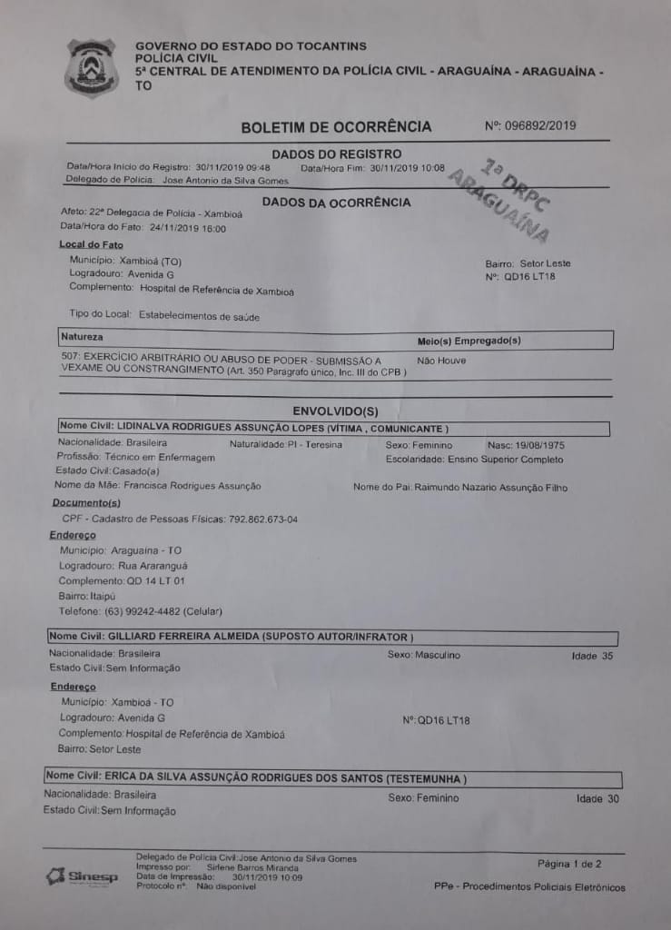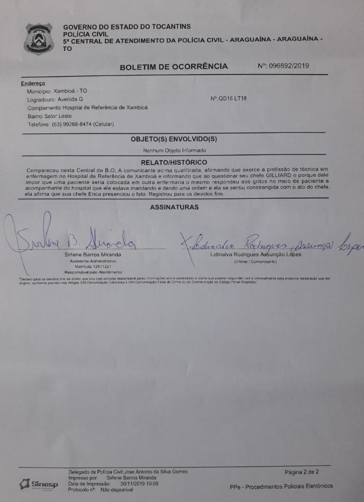 O Diretor do Hospital Regional de Xambioá, no norte do Tocantins, Gilliard Ferreira Almeida, está sendo acusado de assédio moral.