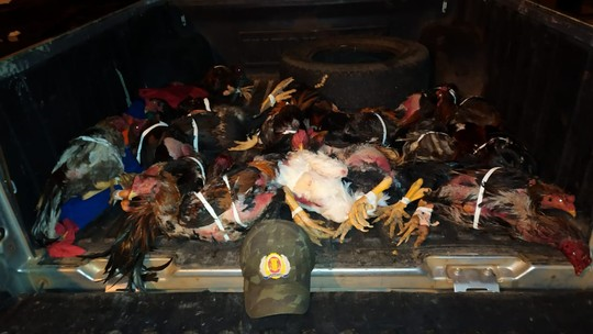 A polícia chegou até a rinha após uma denúncia anônima. O local é improvisado e tem um espaço para os galos brigarem.