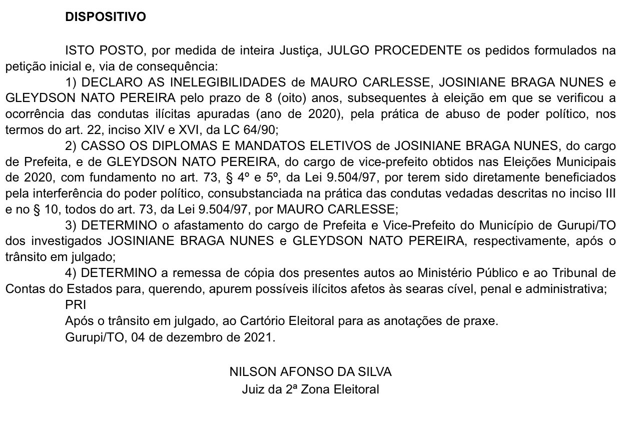 A justiça eleitoral do Tocantins determinou a inelegibilidade por oito anos do governador afastado Mauro Carlesse e da prefeita de Gurupi Josi Nunes (PSL) e do vice-prefeito Gleydison Nato Pereira.
