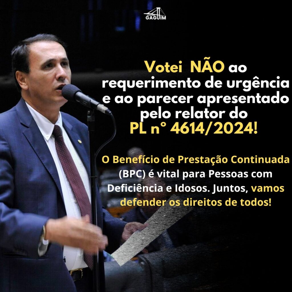 classificando essa conquista como histórica e consolidada, que não pode ser prejudicada. Durante a votação do Projeto de Lei nº 4614/2024 na Câmara dos Deputados, Gaguim votou NÃO ao requerimento de urgência e ao parecer apresentado pelo relator, destacando os riscos que as alterações representam para milhões de brasileiros.